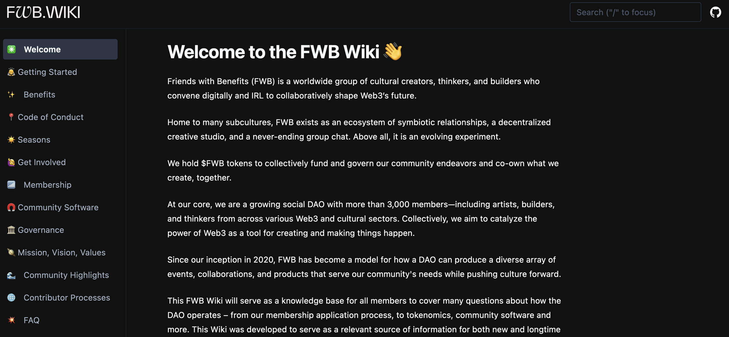 One of the on-going needs identified by our members was the lack of a reliable ‘source of truth’ for the DAO’s information and documentation. Discord is our primary source of communication, but it serves as a poor archive to look back at things historically and find important messages. Because of this I launched a FWB Wiki in the fall of 2022, a source to answer questions on governance, membership structure, contribution pathways and more. This project involved me compiling documentation across departments and writing 30+ pages of documentation to summarize it for members. I published this project through GitHub to design it to be open-source, this is the first version of the wiki and members are encouraged to iterate upon it and add to it based on their own questions. The wiki can be viewed here.